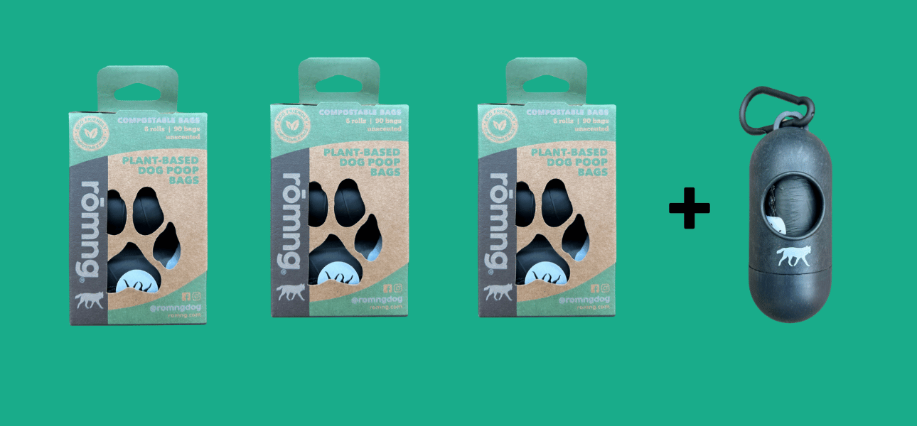 Kickstart your eco-adventure with the rōmng Compostable Poop Bag Starter Pack! This bundle includes 3 boxes (18 rolls, 270 bags) of our TUV Austria-certified compostable dog poop bags, crafted from zero-plastic, plant-based (corn starch) materials, plus a black compostable dispenser with an extra roll (19 rolls total, 285 unscented bags). Sized at 9" x 13" and extra-thick 18 microns, these leak-proof, nature-inspired bags come in a recycled paper box and core, fitting all standard dispensers. Enjoy discounted shipping (restrictions apply) and a design built for adventurers. Supplies are limited—grab yours now!